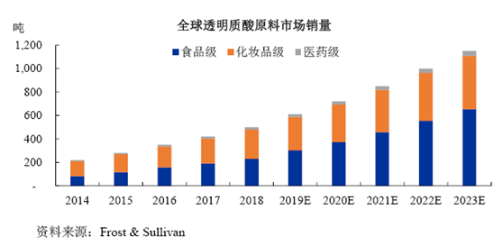 近年来一枚市场的迅速扩张,使得透明质酸原料的销量保持快速增长。根据研究机构Frost & Sullivan的分析,2018年,全球透明质酸原料销量达到500吨,2014-2018年复合增长率为22.8%,预计未来五年将保持18.1%的高复合增长率,预计2023年销量可增长至1,150吨。2018年,食品级、化妆品级和医药级透明质酸原料的销量分别达到230吨、250吨和20吨,2014-2018年复合增长率分别为29.4%、18.0%和22.1%,预计2023年销量可分别增长至654.3吨、454.5吨和41.2吨。