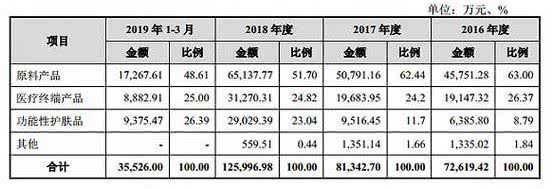 公告显示,华熙生物在报告期内的营业收入99%以上都是来源于原料产品、医疗终端产品、功能性护肤品三类产品的收入构成,三类产品占主营业务收入的比例分别为98.16%、98.34%和99.56%。报告期内,原料产品业务占主营业务收入的比例超过50%,是公司的核心业务之一。