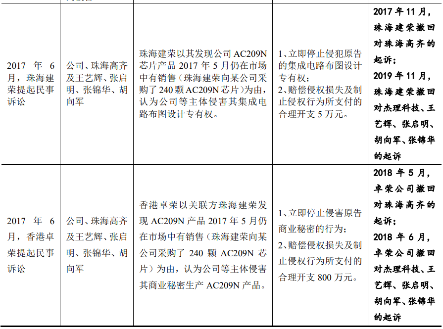此外,根据招股书披露,2012年-2017年,珠海建荣及其子公司发起了长达五年的三次诉讼,以侵犯商业秘密、电路布图设计专有权侵权等为由,欲追究杰理科技实控人王艺辉等人刑事和民事责任,诉讼金额从5万元到800万元不等。但上述起诉并未成功。