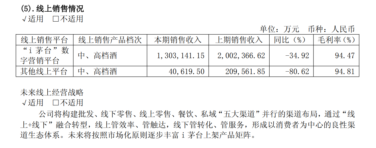其中,线上销售平台中,通过“i茅台”数字营销平台实现销售收入130.31亿元,同比下降34.92%。其他线上平台销售收入4.06亿元,同比下降80.62%。据记者计算,“i茅台”贡献的收入占到了直营渠道的15.41%,较2024年的26.75%明显下滑。财报还提到,未来将按照市场化原则逐步丰富i茅台上架产品矩阵。
